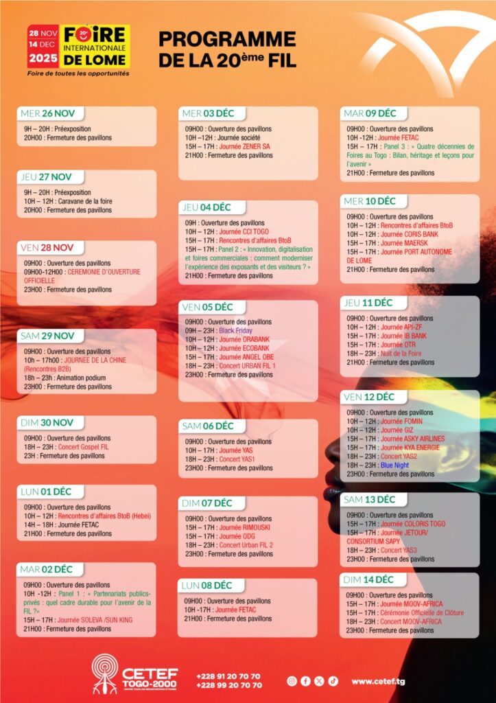 Rappelons que plus tôt dans la matinée du jeudi 27 novembre 2025, une grande caravane de voitures, de motos et d’hôtesses vêtues aux couleurs de la FIL20-40ANS a circulé dans les rues de la capitale togolaise, Lomé et ses environs afin de mettre en lumière et d’annoncer l’importance de cet événement commercial d’envergure internationale de cette fin de l’année.