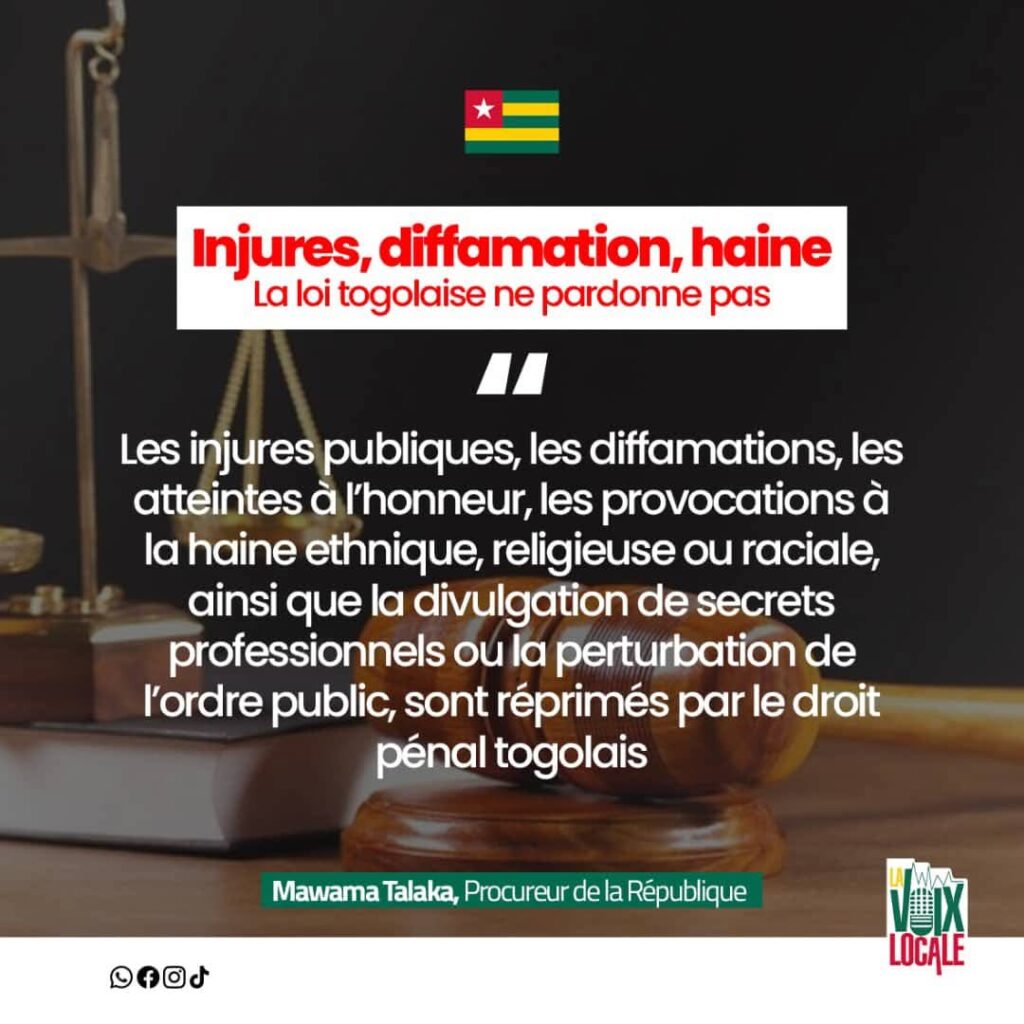 « Les injures publiques, la diffamation, les atteintes à l’honorabilité, ainsi que les incitations à la haine ethnique, religieuse ou raciale, la divulgation de secrets professionnels et la perturbation de l’ordre public sont sanctionnées par le droit pénal togolais ».