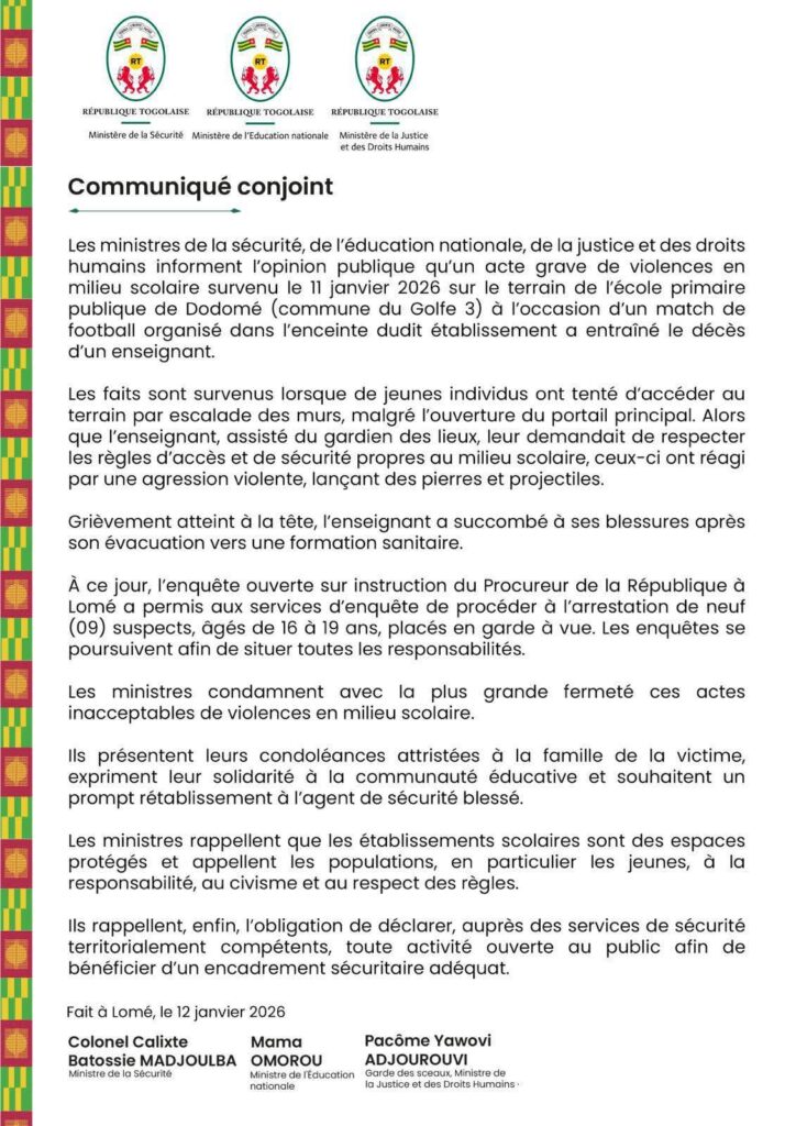 Un enseignant a été mortellement agressé par des jeunes le dimanche 11 janvier 2026, dans l’enceinte de l’école primaire publique de Dodomé, située dans la commune du Golfe 3. Cet incident a eu lieu en marge d’un match de football organisé dans l’établissement. Neuf suspects ont été identifiés et arrêtés par la police.