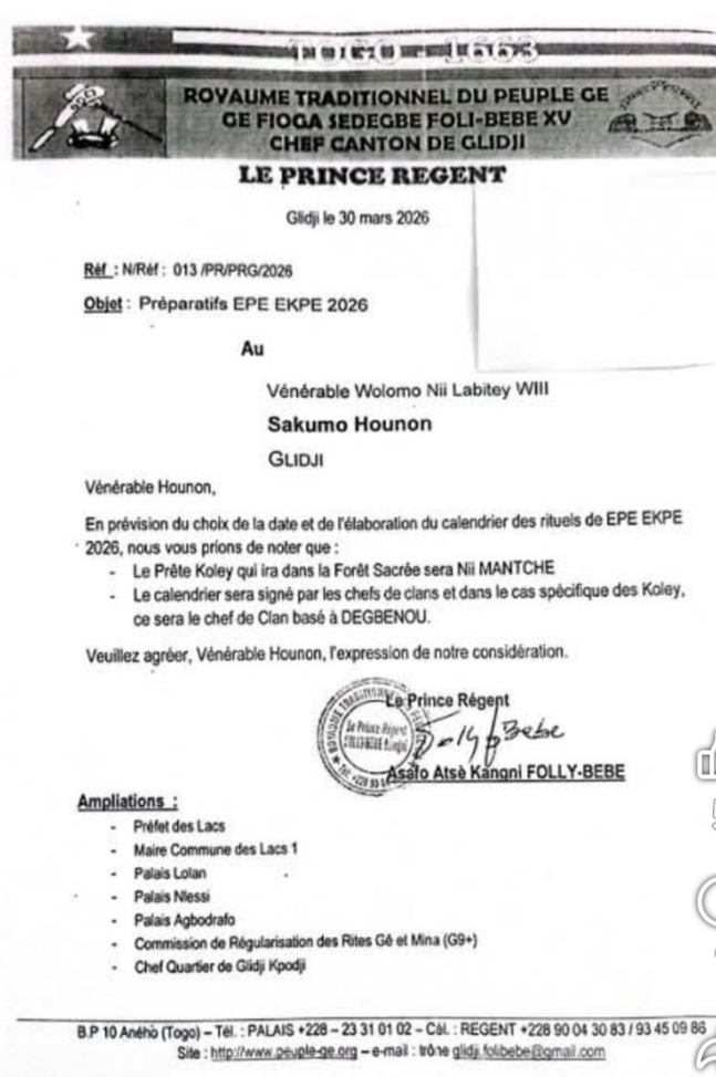 Au centre des discussions litigieuses se trouve la lettre du régent Asafo Atsè Kangni Folly-Bebe, datée du 30 mars 2026, désignant le prêtre koley Nii Mantchè, qualifié de « controversé » (sic), comme celui qui « ira dans la Forêt Sacrée ».